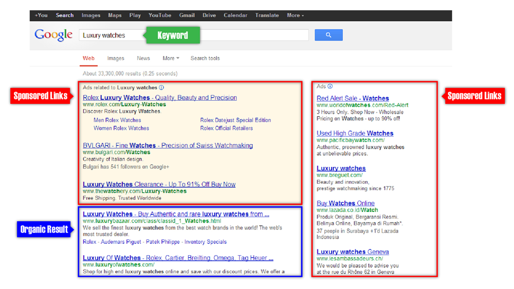 SEO (organic results) and PPC (sponsored links) as seen in a Google search for Luxury Watches (keyword)